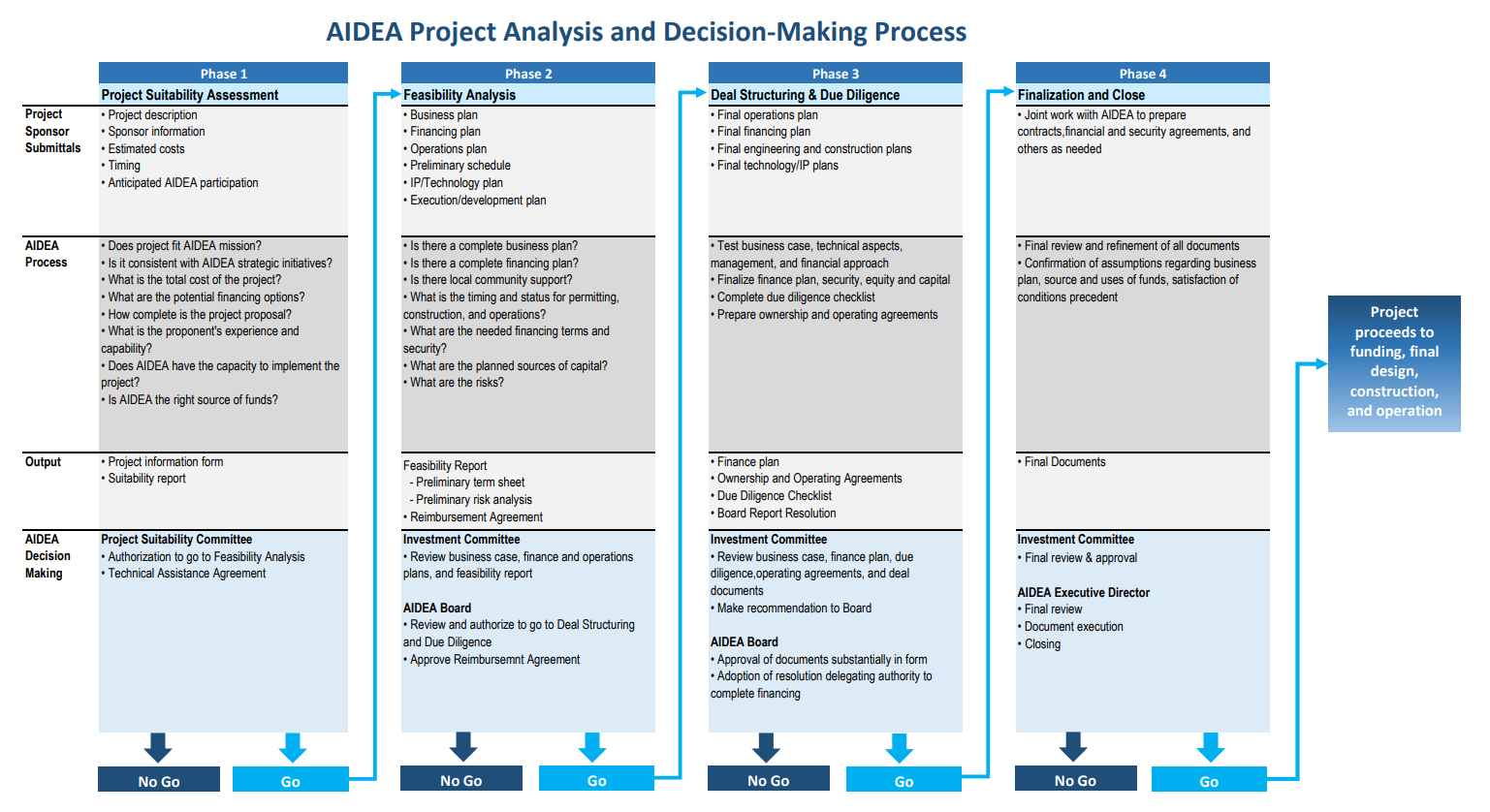 AIDEA has developed a four-phase process by which it can determine whether a potential project meets AIDEA’s mission and strategic initiatives and whether it is feasible. All four phases are designed to ensure that the project under consideration meets specific criteria and is evaluated to the extent that the project can move through the various “gates” of the decision-making process.
